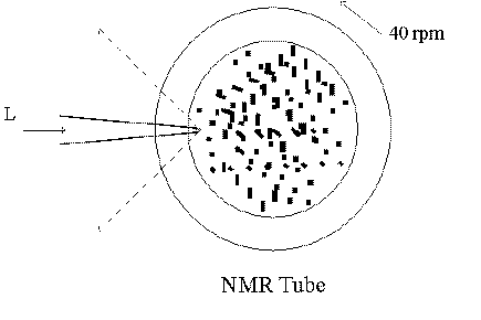 In addition to periodic variations caused by rotation, the crystals themselves will be illuminated by the laser for short periods of varying lengths. Let us look at this a little closer. The laser beam is about 300 m m in diameter. The permanganate powder particles average about 100m m in size. Figure 11 shows the NMR tube, filled with powder, rotating at 40 rpm.